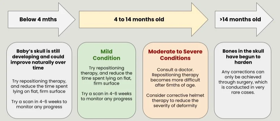 Cranial remolding orthosis is best suited for children between 4-10 months. Children younger than 3 months respond well to repositioning. After three months, the baby starts turning and changing positions, positioning therefore loses its meaning. In this period, physician reassesses the shape of the baby’s head to determine whether the baby should use a cranial remolding orthosis.