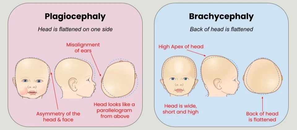 Torticollis: Congenital muscular torticollis is a condition where the muscles of the neck are tight or shortened on one side, causing the baby to tilt their head to one side and have difficulty turning it. This can lead to uneven pressure on the skull and contribute to flat head syndrome.